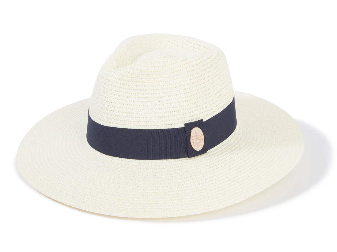 Complete your accessory collection with the timeless chic of The Hemley Fedora. This elegant piece is crafted from breezy paper straw, perfect for warm weather days. From leisurely garden days to sandy beachfront strolls, The Hemley Fedora adds sophisticated style to every sun-filled moment. With our iconic gold crest branding and a sleek navy ribbon band, this fedora is both stylish and functional.