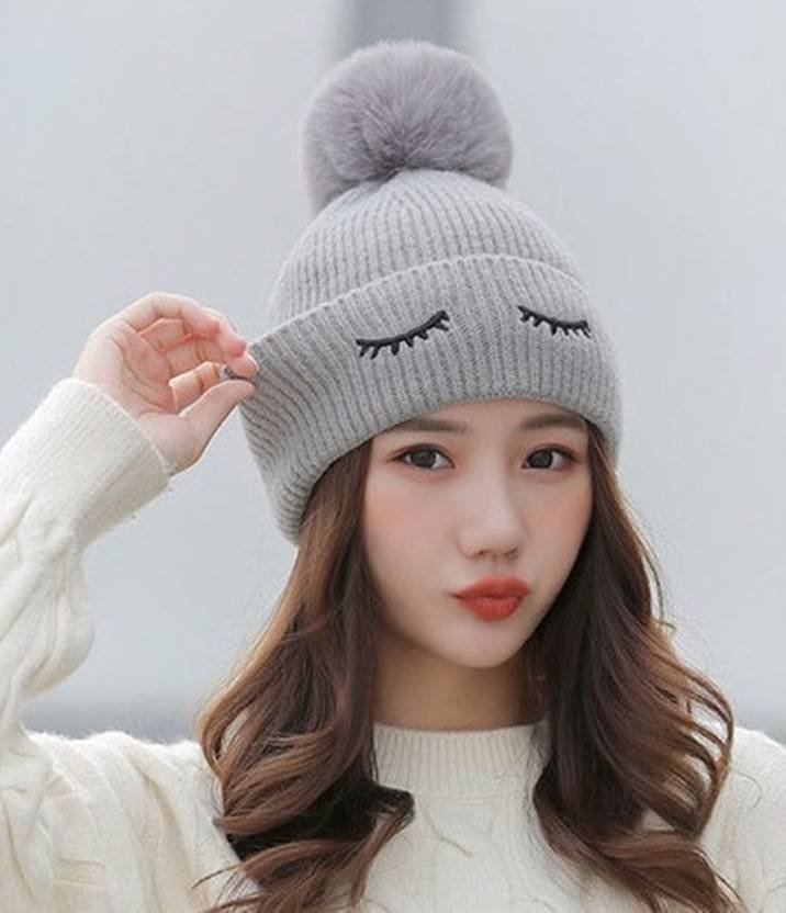 Women’s stylish winter woolen cap soft warm fur inside pom-pom on top for girls Woven Beanie